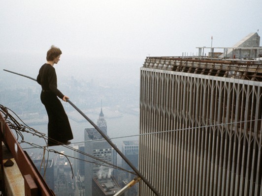 約30年前のNY、ワールドトレードセンタービルの間で綱渡りをした大道芸人がいた。